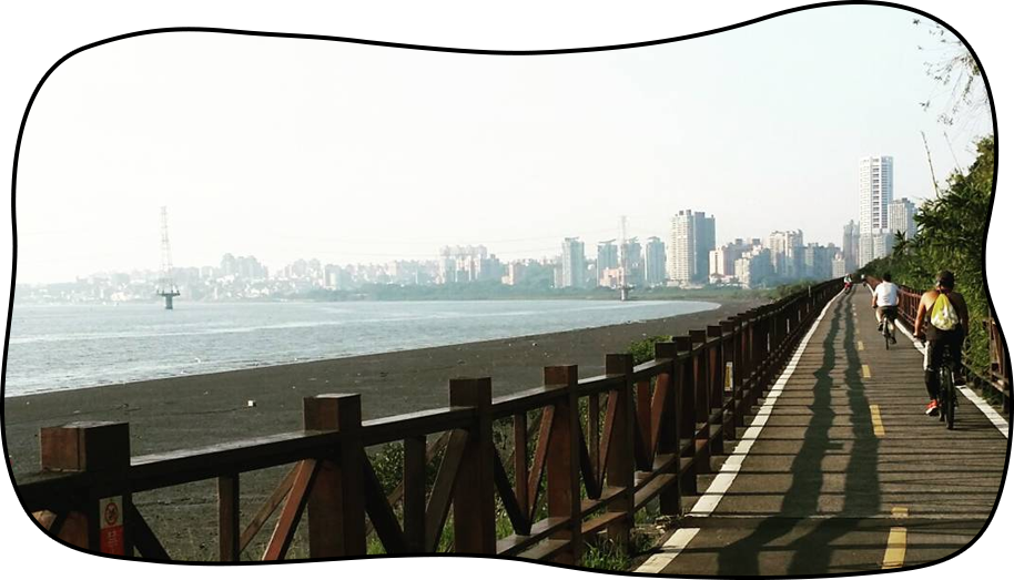 大家所熟悉的淡水河岸,其實有條名聲很優雅的自行車道,叫做「金色水岸」,起點自關渡宮附近的中港河入口一直沿著河岸到淡水老街。這條自行車道長約10公里,非常平整好騎,很適合親子一起觀察白鷺鷥與招潮蟹等生態,一邊享受騎乘樂。騎到鼎鼎大名的「淡水老街」,在街道兩旁林立熱鬧的商店,包含有濃濃古早味的米行、餅舖、布店、雜貨店等;以及充滿現代感的潮流服飾、玩具等,形成古今交融的特殊商圈文化。